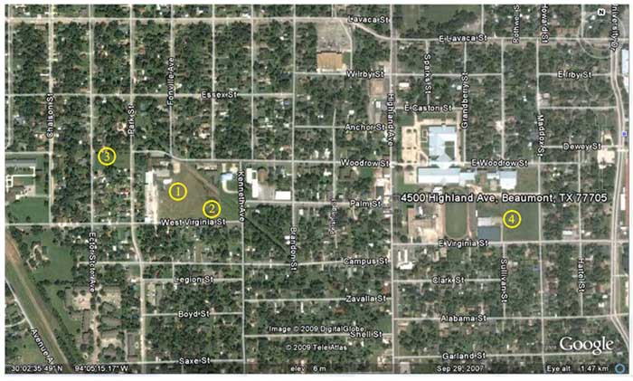 2 One (1) acre of land being offered to BISD gratis (free) if BISD builds new middle school on this block; just north or the "2" is the South Park Fire Station, which would be in a perfect place for rescues at the school, or in case of injured student needs emergency transporation. 3 Another acre of land whose owner is willing to sell for $25,000.00 to anyone interested. County appraisal is around $18,000-20,000 according to owner. One of the criticisms of this site which Dr. Thomas had was that school buses couldn't be turned around on the narrow streets, Woodrow and West Virginia. Putting a bus garage at "3" solves the problem with the school buses, and is also off-campus. 4 The area behind the SPMS Historic Building is perfect to build the new school. All but between one and five of the temporary buildings were moved in and assembled after the lawsuit was filed and Temporary Restraining Order (TRO) granted. |