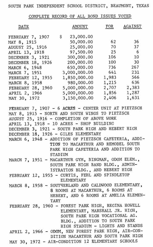 Our New School Building ![]() (Thank you, Alfred N. Perez) Everyone, who is interested in South Park has for some time been looking forward to our new school building. Why should'nt they ? Building signifies growth. We have outgrown our present building in several respects, therefore, we all welcome our new school building. This new building will consist of three floors, the ground floor, main floor And second floor. It will be three hundred feet long and two hundred and four feet wide. A wide flight of steps leads up to the main entrance which is in the center of the building on the main floor. Below these stairs there is a storage space and the two main entrances on the ground floor. Upon entering, the ground floor we find has a large lobby which opens into a wide corridor on both sides. Back of this are a large cafeteria and a splendid gymnasium. The gymnasium is provided with a ball court and bleachers which will seat about five hundred. There are also two stairways leading to the stage and auditorium upstairs. This will be of advantage when giving pageants and plays. The ground floor also contains the Commercial Department to the right of the lobby. It is composed of an office, a small bank and a room, each, for typewriting, stenography, and book-keeping. On the same side of the building there is a printing shop and a room for recitations in education. On the left, one finds a trophy room and a small storage room and five class rooms. Three of these are, science rooms for Biology and Agriculture; Zoology and Lectures. The other two are for Mathematics and recitations. The main floor is divided similarly to the ground floor. The entrance opens into a vestibule and lobby. Both sides of this lobby lead into a large corrider which runs the length of the building. The class rooms are situated on each side of the corridor. To the left of the lobby are three offices and a room for the Board meetings. There are also four class rooms, two for History and Economics, one for Mathematics and a recitation room for the other, while on the right two offices for the principal and his secretary and a stack room and the other a small study hall for the college students. At the end of the corridor there is a large study hall for the high school students. An auditorium, which seats seven hundred and fifty-two. and the bleachers for the gym come back of the main floor lobby. The second floor has the central corridor as well. The middle part of this floor toward the front is taken up by the English Department which consists of four large recitation rooms. The rear forms the balcony of the auditorium, giving seating room for three hundred and sixty, and the upper part of the stage with dressing rooms. This space will probably be used for voice training and music. The floor to the right is occupied by three rooms for modern languages and an art studio. The rest is for two laboratories for Physics and Chemistry. With these go a lecture room and two small rooms to be used as a preparation room and a dark room. The Home Economics Department will have a separate building, a complete modern bungalow. It has a reception room with doors opening into the different departments. There are six rooms, equipped for the different departments, one each for home nursing, home laundry, cooking laboratory, serving laboratory, and dining room. There is also a small office, a breakfast room, and three model kitchens in connection with the Cooking Department. The main building will have twenty-five or more recitation rooms, exclusive of the offices. It will surely be a most splendid institution for the South Park Community. South Park High School Charter Class of 1922 Board Of Trustees L.M.Hebert , President ; S.B.Eddy , Vice-President ; J.L.Giles , Secretary ; Wm.White , W.T. Wherry , L.D.Hunsucker , J.T.Bond (Deceased) , Succeeded By T.Hahn And L.R.Pietzsch , Recording Secretary The majority Of the present board have served the school district for the past six years, and are, therefore responsible for the present remarkable growth of the school. They are men Of progress, and believe there is nothing too good for the children of South Park to futher their educational development. Their plans for a junior college are now being realized. Senior Class Officers Woodard Ritter..........President Eugene “Gene” Gorman Kathleen “Kat” Nelson Marceline “Marse” Pierce Gladys Busbee Vernon “Pat” Boyt Beatrice “Bea” Baker Lois Jones Anna Koelemay Herndon Peyton Irma “Irms” Butler Willie Ben “Billie” Barnes Edna Thomas Woodard Ritter Josephine “Jo” Turner Kariene “Fatty” Brown Ruby “Booby” Bristol Lewis “Doc” Swails Katherene “ K. T.” Tally Inez “Nez” Hall |
